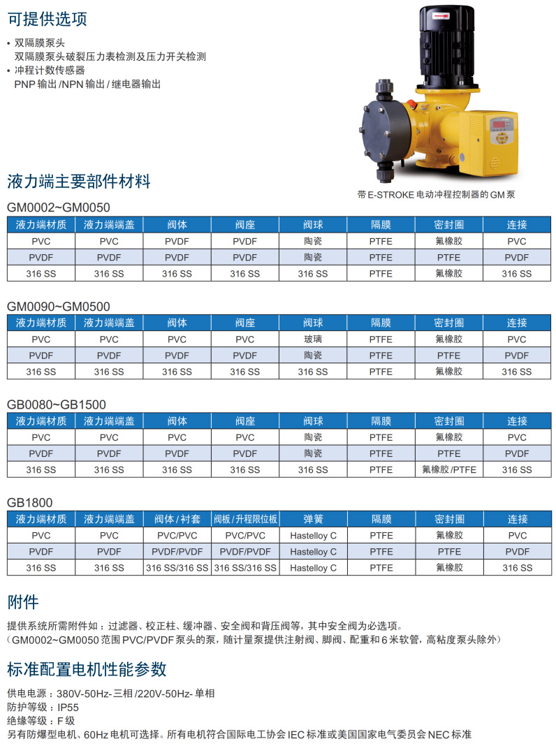 提供系統所需附件如 : 過濾器、 校正柱、 緩沖器、 安全閥和背壓閥等, 其中安全閥為必選項。(GM0002~GM0050范圍 PVC/PVDF泵頭的泵, 隨計量泵提供注射閥、 腳閥、 配重和 6米軟管, 高粘度泵頭除外)